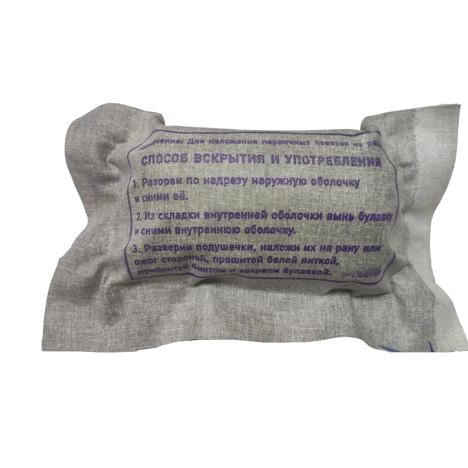 Изделие изготавливается в соответствии с ГОСТ 1179-93. Пакет состоит из повязки (ватно-марлевая неподвижная подушечка, ватно-марлевая подвижная подушечка, марлевый бинт); безопасной булавки; упаковки (внутренняя оболочка и наружная прорезиненная оболочка). Размер подушечек: 32,0±1,5 см × 17,5±1,0 см, размер марлевого бинта: 7±0,3 м × 10±0,5 см, плотность марли — 36 г/кв.м.