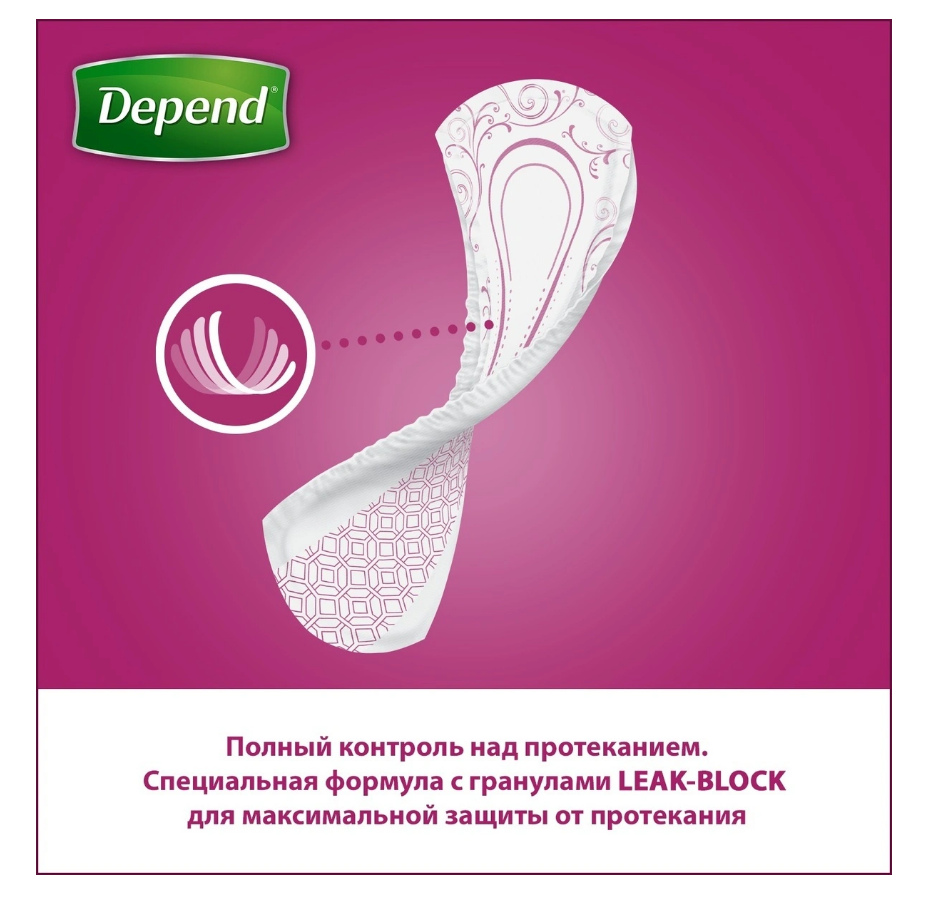 Прокладки Depend Super для защиты при среднем недержании - впитываемость: 5/8 (5 капель из 8).