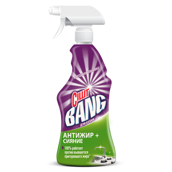Cillit BANG Мощное средство Анти-жир устраняет даже въевшийся пригоревший жир, а также масляные пятна и грязь по всему дому. Он идеален для кухни, кастрюль, сковородок, посуды и даже для гаража и садового участка.