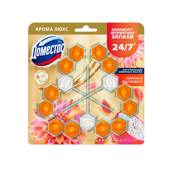 Блок для туалета Domestos Power 5 Trio Экзотический букет против известкового налета и неприятного запаха — это пять преимуществ, помогающих обеспечить защиту от загрязнений и микробов и сохранить чистоту и блеск. При каждом смывании появляется яркий аромат драгонфрута и георгина на срок до 4 часов и обильная пена, которая борется с налетом, поддерживая гигиену и блеск поверхности унитаза.
