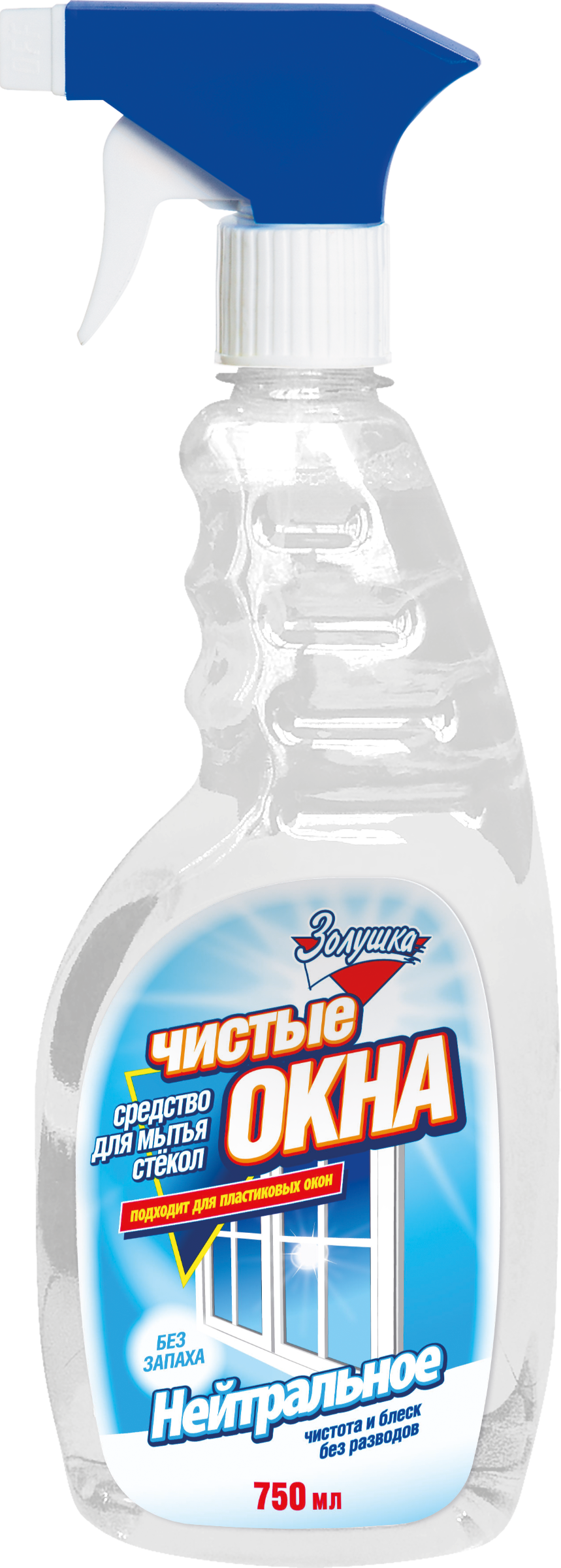 Средство Золушка Чистые Окна Нейтральное (с распылителем) для мытья оконных стекол, зеркал, витрин, автомобильных стекол, кафеля, хрусталя, фарфора, а также изделий из нержавеющей стали и хромированных поверхностей. Средство незаменимо для мытья окон с пластиковыми рамами, т.к. не содержит агрессивных веществ, повреждающих пластиковые поверхности.