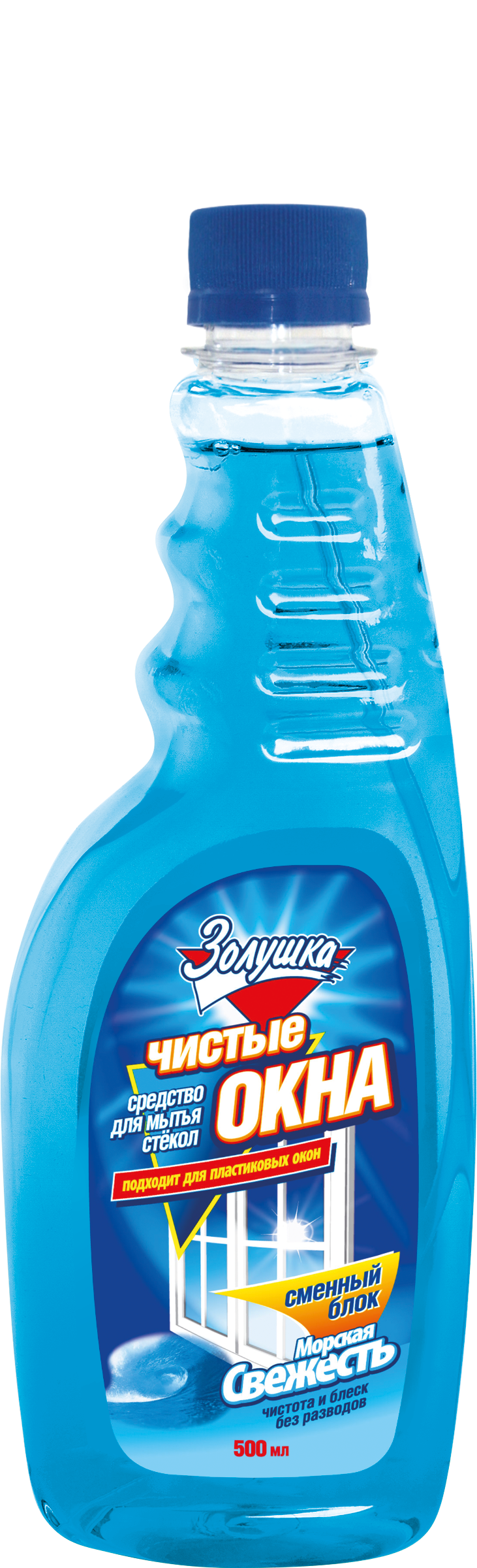 Средство Золушка Чистые Окна Морская свежесть (сменный блок) для мытья оконных стекол, зеркал, витрин, автомобильных стекол, кафеля, хрусталя, фарфора, а также изделий из нержавеющей стали и хромированных поверхностей. Средство незаменимо для мытья окон с пластиковыми рамами, т.к. не содержит агрессивных веществ, повреждающих пластиковые поверхности.
