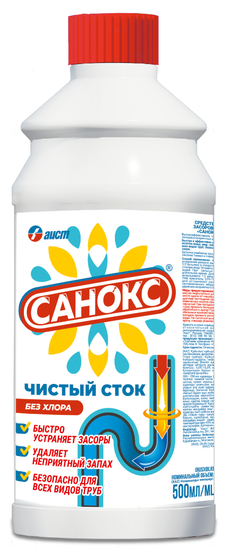 "Санокс"- чистый сток - высокоэффективное гелеобразное средство для устранения засоров и неприятных запахов в сливных стоках.