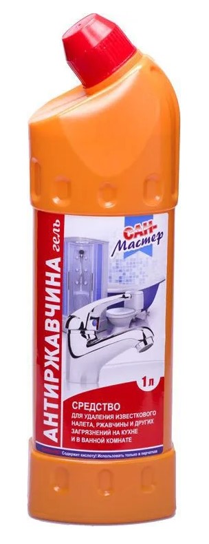 Сан-Мастер Антиржавчина Гель - концентрированное гелеобразное средство для удаления известкового налета, ржавчины и других загрязнений на кухне и в ванной комнате. Нетоксично, биоразлагаемо, пожаро-, взрывобезопасно. Приемлемое качество водопроводной воды большая редкость. Чаще приходится сталкиваться с присутствием примесей в виде железа и кальция. В результате на сантехнике образовывается белый или ржавый налёт, который портит внешний вид. Чтобы избавиться от него подойдёт гель Антиржавчина под торговой маркой Сан-Мастер. Он разработан специально для удаления налёта и справляется с этой задачей, не повреждая глянцевые элементы. Мощная формула удаляет даже застаревшие подтёки, не оставляя от них и следа. Гель для сантехники отлично справится с очисткой стальных полированных деталей, керамических раковин и ванн, а также с очисткой унитаза. Хранить в сухом помещении, предохраняя от прямых солнечных лучей, в дали от отопительных приборов, в недоступном для детей месте при температуре от-30°С до +30°С.