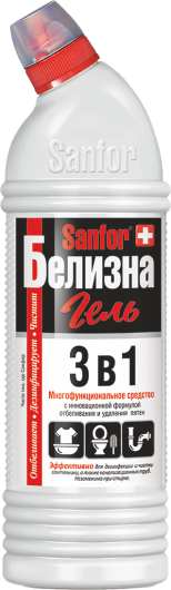 Белизна 3 в 1 — специальное густое средство с инновационной формулой отбеливания и удаления пятен. Благодаря комплексному действию незаменимо при стирке, а также для дезинфекции и чистки сантехники и труб. Многофункциональное средство отбеливает, дезинфицирует, чистит: ванны, раковины, унитазы, канализационные стоки, пол, кафель, пластик, посуда (кроме металлической). Загущенная консистенция хорошо удерживает гель на вертикальных поверхностях.