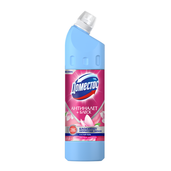 Гель Domestos с ярким ароматом цветущей магнолии блокирует неприятные запахи и оставляет свежесть в туалете и ванной комнате. Очищает стойкие загрязнения и известковый налет, удаляет до 100% бактерий'. Domestos Цветущая магнолия — густое и экономичное средство, которое имеет розовую гелевую текстуру и помогает устранять неприятные запахи, налет и бактерии в доме. Чистящее средство Domestos Цветущая магнолия можно использовать для уборки и очищения туалета, ванны, раковины, плитки, рабочих поверхностей на кухне и полов. Domestos Цветущая магнолия: - очищает сантехнику до блеска от налёта и других загрязнений; - блокирует неприятные запахи - наполняет комнату ароматом магнолии после уборки; - имеет удобный изогнутый дозатор. Все гели Доместос оснащены специальном колпачком от открывания детьми.