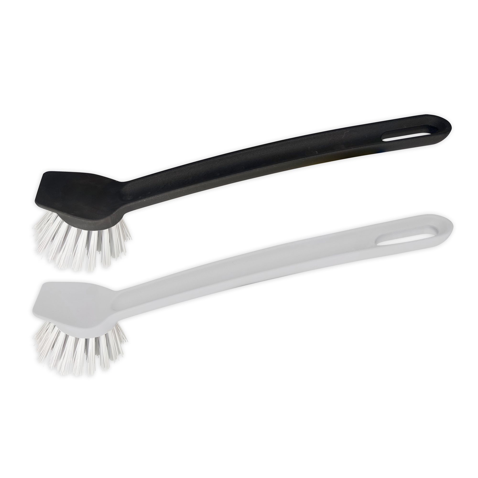 Классическая универсальная щетка для мытья посуды. Незаменима в любом доме, даже если у вас есть посудомоечная машина. Имеет щетину средней жесткости и пластиковый скребок на конце, с помощью которого легко, но деликатно удаляются самые стойкие загрязнения с посуды и кухонной утвари. Щетина расположена под нужным углом для достижения максимального эффекта, позволяет добраться до самых труднодоступных мест.