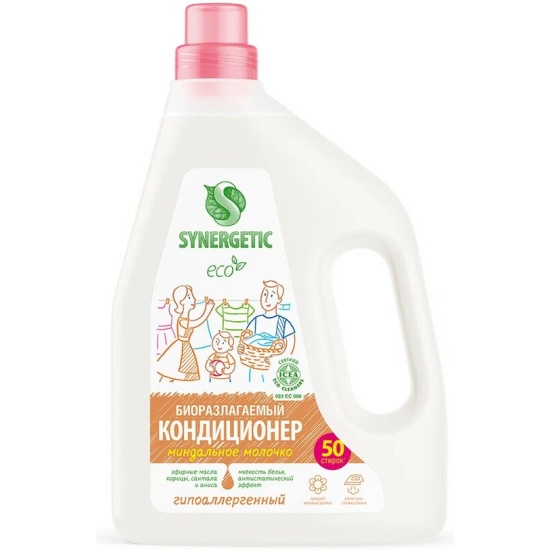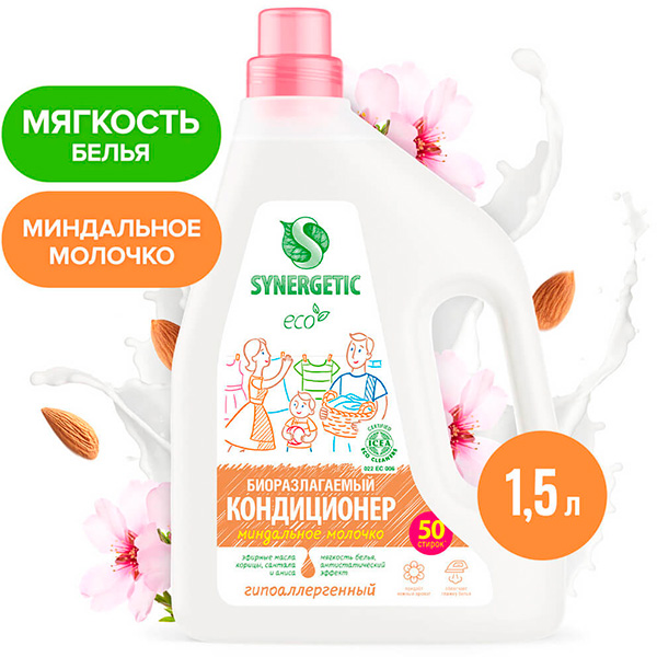 Гипоаллергенный кондиционер-ополаскиватель для белья Synergetic Миндальное молочко – высокоэффективное средство, бережно ухаживающее за всеми типами ткани и придающее особую мягкость белью после стирки. Обладает антистатическим эффектом. Комплекс растительных К-тензидов обеспечивает легкую глажку белья. Гипоаллергенная отдушка с маслами корицы, сантала и аниса придаёт белью нежный аромат. Подходит для ручной и машинной стирки, полностью выполаскивается из тканей.