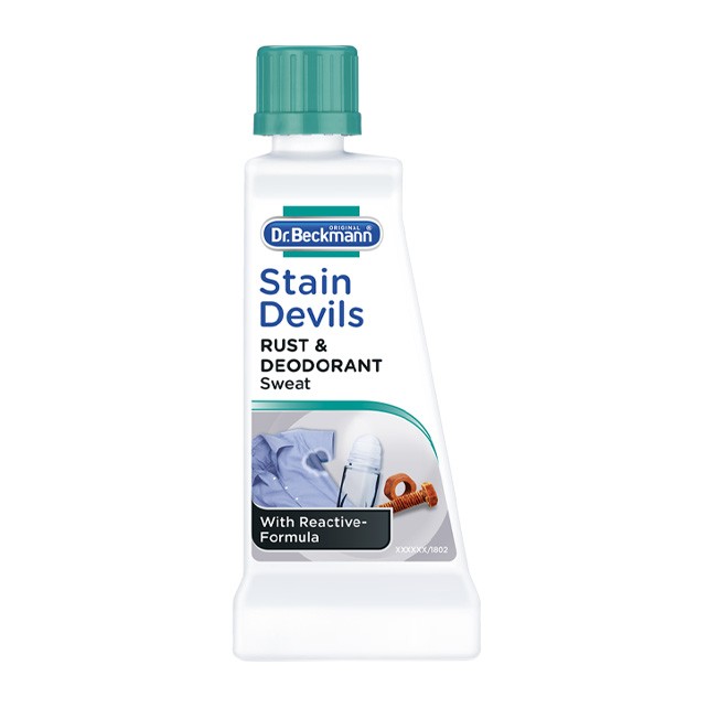 Dr. Beckmann Эксперт пятновыводитель: ржавчина и дезодорант с реактивной формулой. Удаляет ржавчину, дезодорант и пятна от пота с одежды. Также применимо для ржавчины на плитках, ваннах и т. д. Подходит для тканей, пригодных и не пригодных к стирке. Защищает цвета и ткани.