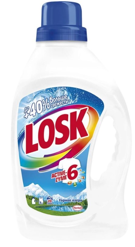 Гель Losk Горное Озеро для белого и светлого белья. Содержит высокоэффективную комбинацию из 6 энзимов, каждый из которых дейтсвует против: распостраненных пятен - трава, загрезнения на манжетах и воротничках, крахмальных пятен, пятен от еды, жирных пятен, появления серого оттенка на вещах, образования катышек на хлопковых и и смесовых с хлопком тканях. Losk - для чистоты и свежести Ваших вещей. Не предназначен для шерсти и шелка.