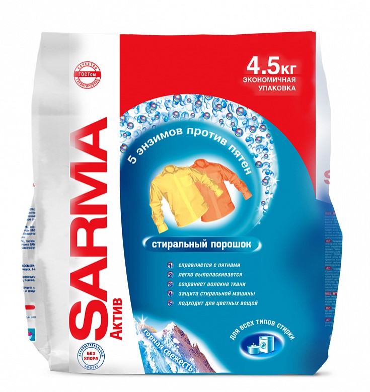 Стиральный порошок для всех типов стирки Сарма Актив с антибактериальным эффектом предназначен для стирки хлопчатобумажных, льняных, синтетических и смешанных тканей, кроме изделий из шелка и шерсти, в автоматических, активаторных стиральных машинах, а также вручную. Благодаря оптимальному уровню пенообразования, серия стиральных порошков «САРМА Актив» позволяет добиться безупречных результатов, как при ручной, так и при автоматической стирке. Порошок отлично удаляет пятна от чая, кофе, шоколада, растительного масла, красного вина, травы, крови, делая вещи идеально чистыми, благодаря комплексу из 5-ти энзимов.