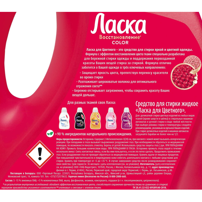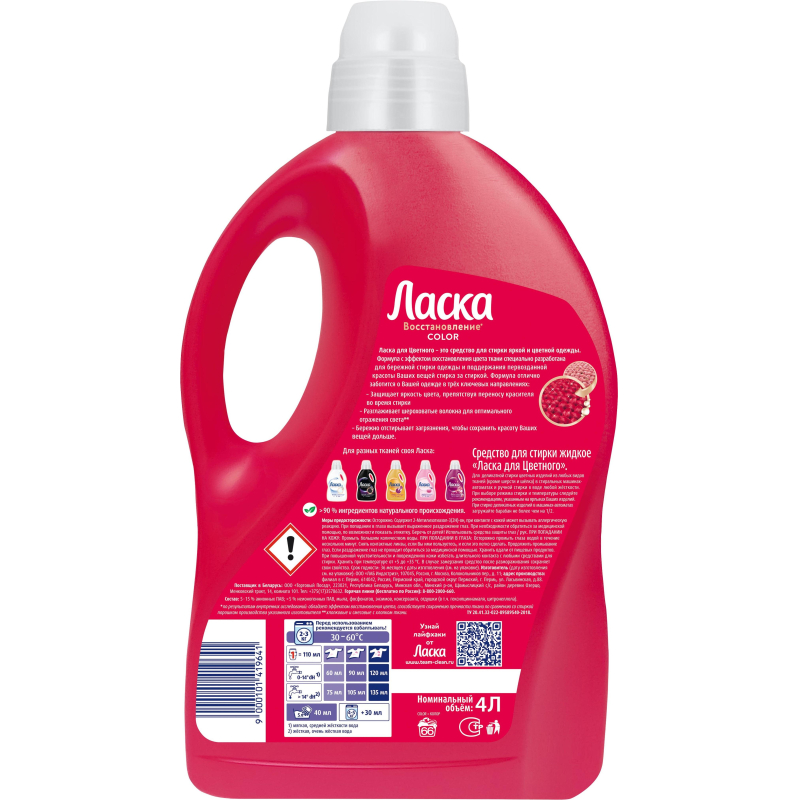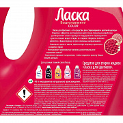 Назначение: жидкое средство Ласка Эффект Восстановления для Цветного 4 л, 66 стирок предназначен для ухода за вашей одеждой ярких цветов и поддержания первозданной красоты вещей стирка за стиркой. Специальная формула Fibrex-tech жидкого средства для стирки Ласка не только бережно отстирывает загрязнения, но и отлично заботится об одежде в двух ключевых направлениях: насыщенность цвета и прочность ткани. — Гель для стирки защищает Ласка деликатно и качественно отстирывает вещи, подчеркивает яркость цвета, препятствуя переносу красителя во время стирки. По многочисленным отзывам покупателей средство Ласка справляется с любыми видами пятен от еды и напитков, следов детского творчества и любой уличной грязи. — Жидкое средство Ласка сохраняет форму ткани, поддерживая эластичность волокон, а также обеспечивает эффект восстановления ткани и способствует сохранению прочности.