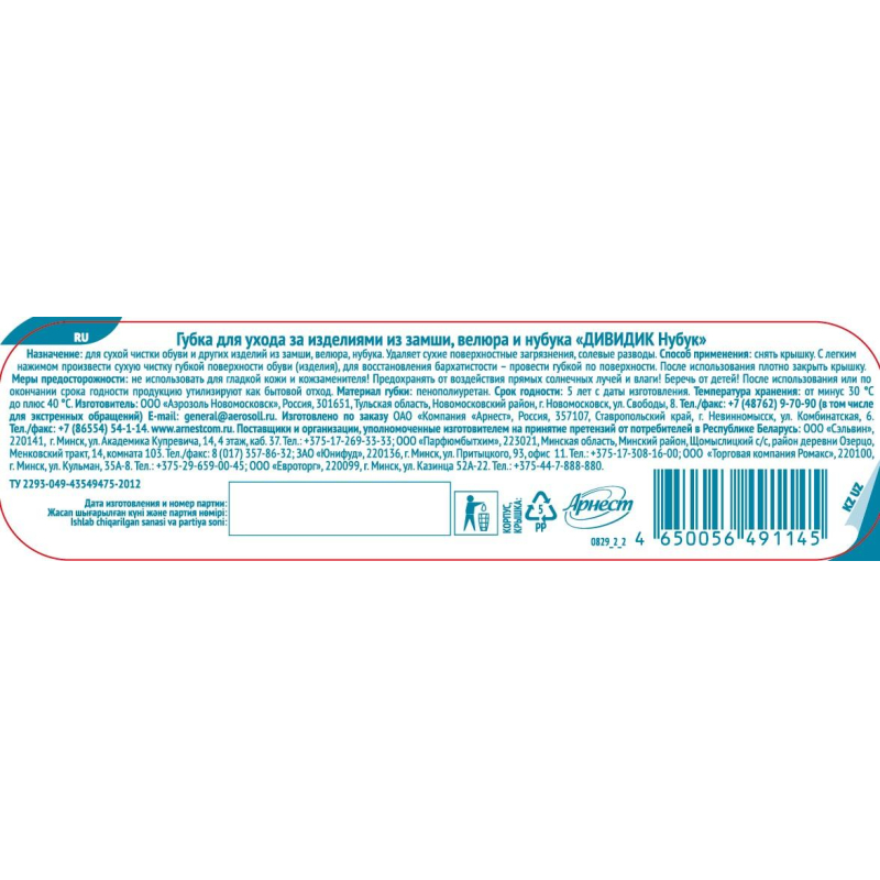 Губка для обуви «Дивидик Нубук» удаляет загрязнения, восстанавливает структуру материала, возвращает вещам первоначальный внешний вид. Губка изготовлена из специального пористого материала для бережной очистки и ухода за изделиями из замши, велюра и нубука.