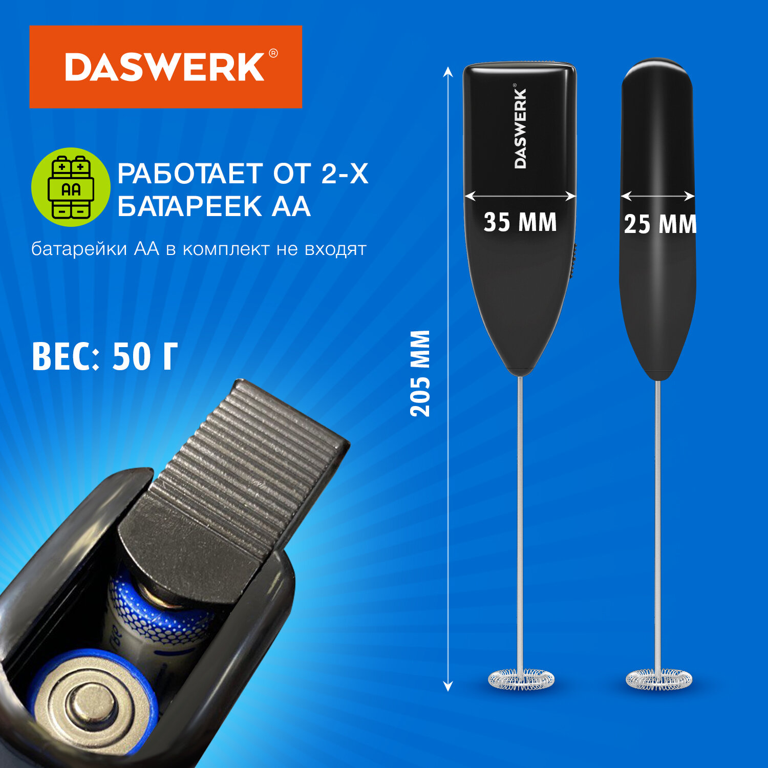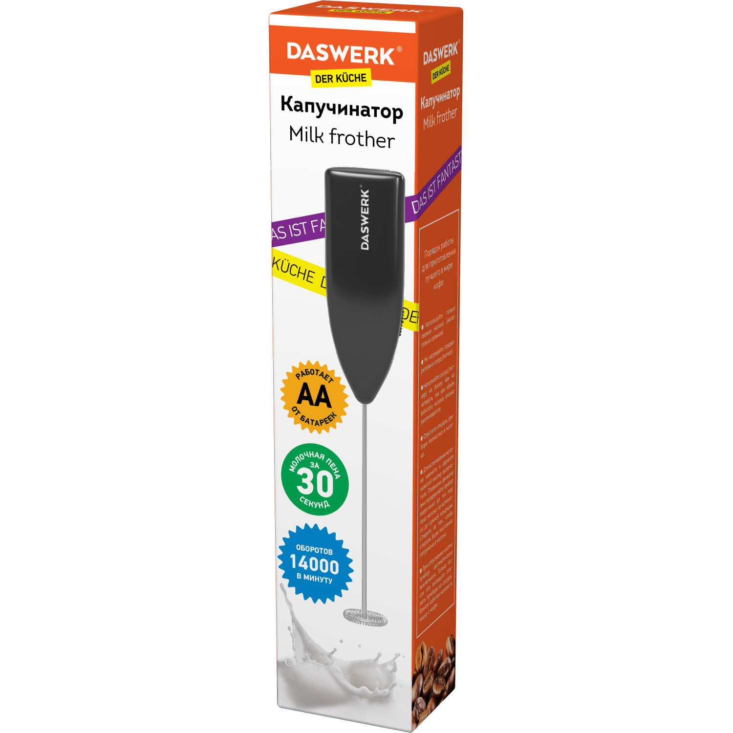 Капучинатор/вспениватель молока DASWERK – это незаменимое устройство для тех, кто любит наслаждаться вкусным кофе в домашних условиях. Создайте пышную пену для любимого напитка за считаные секунды!Многофункциональное устройство может использоваться для взбивания молока, шоколада и других продуктов.Капучинатор оснащен мощным мотором, поэтому моментально создает плотную и бархатистую пену. Он прост в использовании, интуитивно понятен и обеспечивает высококачественный результат. Устройство также имеет элегантный дизайн и отличается высоким качеством сборки, что делает его прекрасным подарком для кофеманов.Важно! Батарейки 2хАА в комплект не входят.