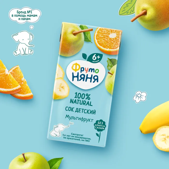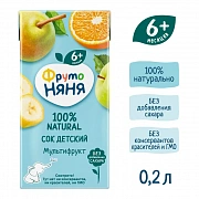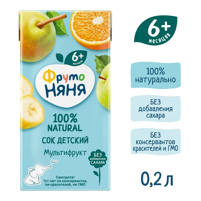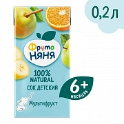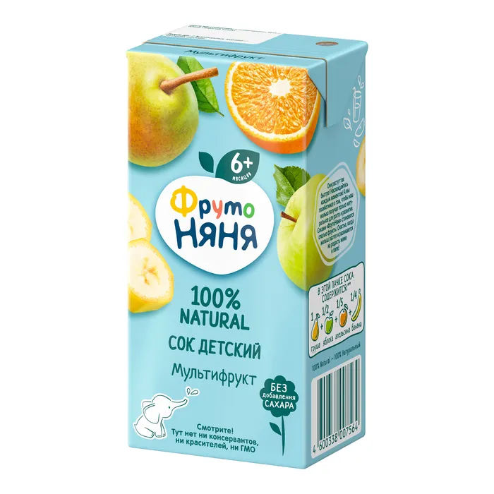 ФрутоНяня сок мультифруктовый неосветленный для питания детей раннего возраста. Восстановленный. Продукт стерилизован и асептически упакован.