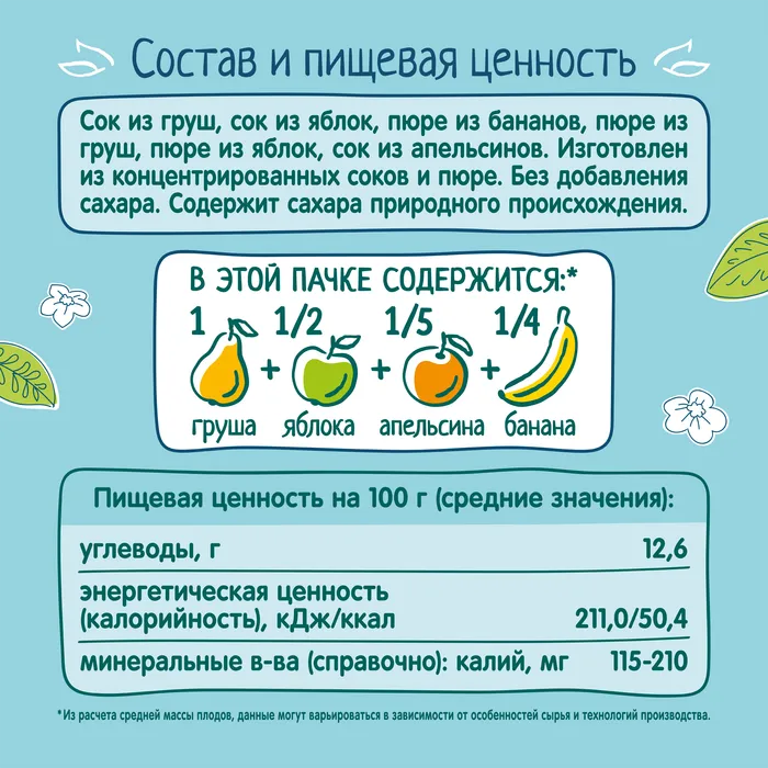 ФрутоНяня 200мл Сок Мультифрукт Груша, яблоко, банан, апельсин с 6 месяцев