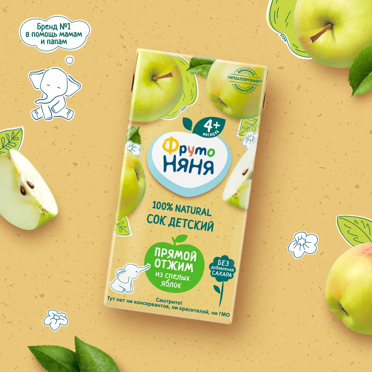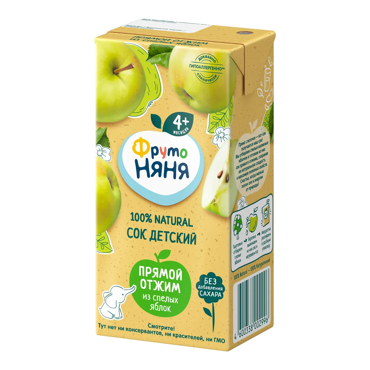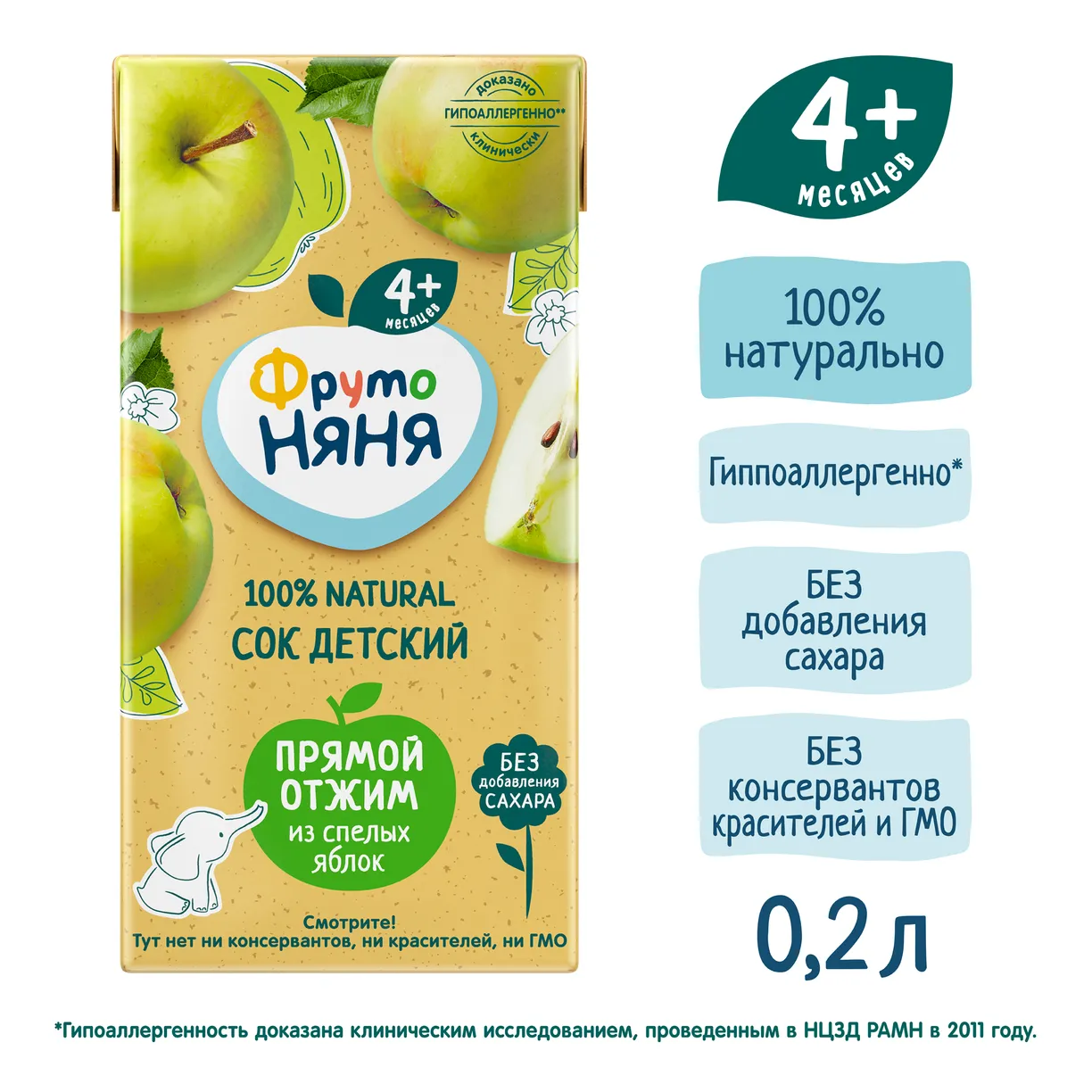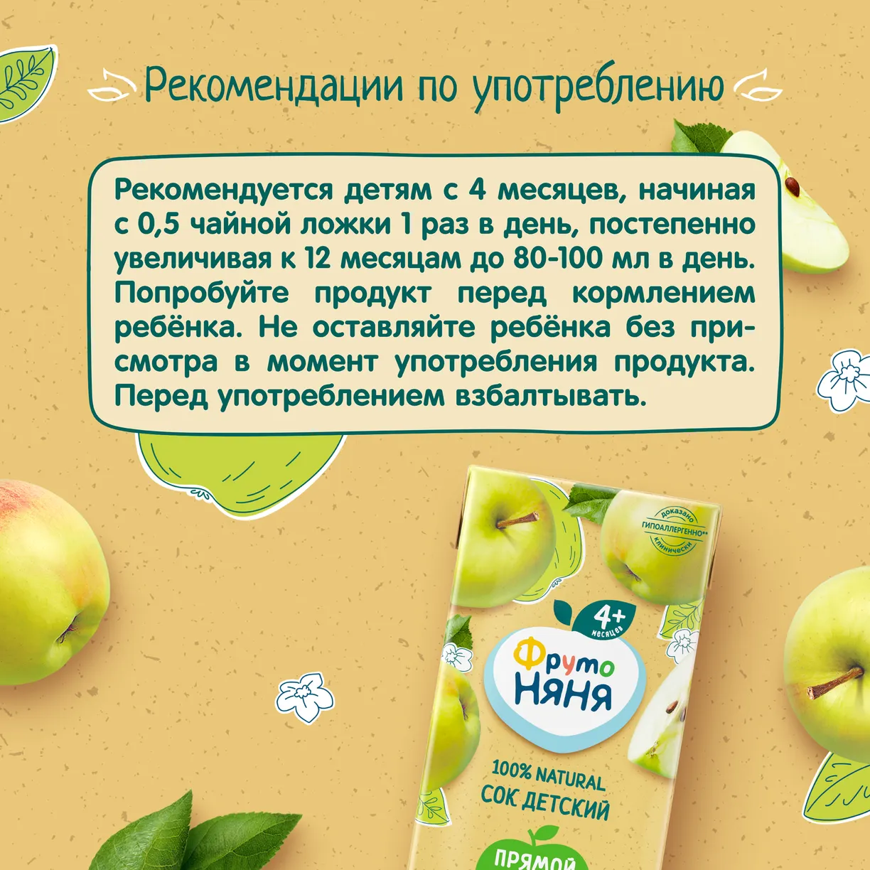 ФрутоНяня сок яблочный прямого отжима неосветленный для питания детей раннего возраста. Продукт стерилизован и асептически упакован.