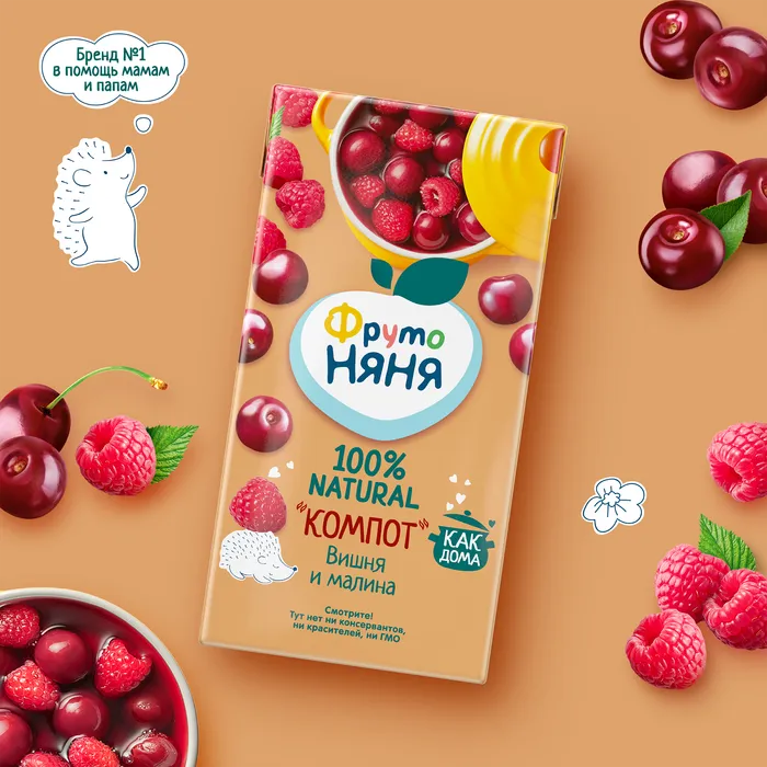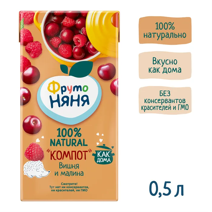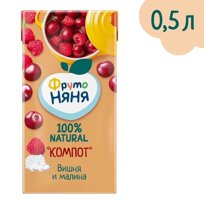 ФрутоНяня напиток вишнево-малиновый сокосодержащий "компот" неосветленный для детского питания детей дошкольного и школьного возраста. Продукт стерилизован и асептически упакован. Вишня богата органическими кислотами, благотворно влияющими на процессы пищеварения. Ягоды малины богаты витамином С, помогающим защитить организм ребенка от инфекций.