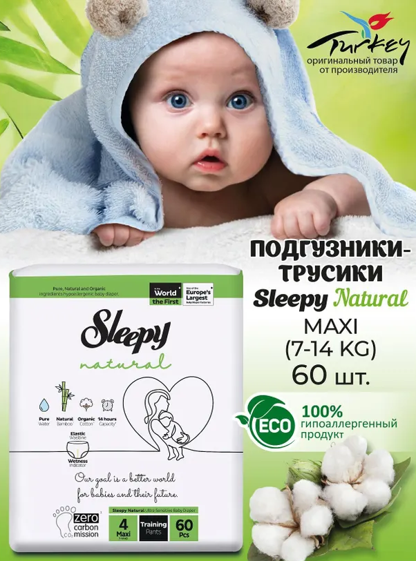 Подгузники-трусики Sleepy Natural Double Jumbo Maxi 60 шт размер 4, 7-14 кг