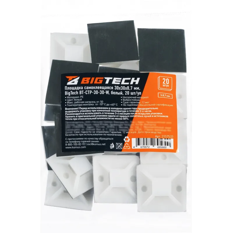 Площадка самоклеящаяся Bigtech BT-CTP-30-30-W,белый,30x30x8,7 мм,20 шт/уп
