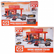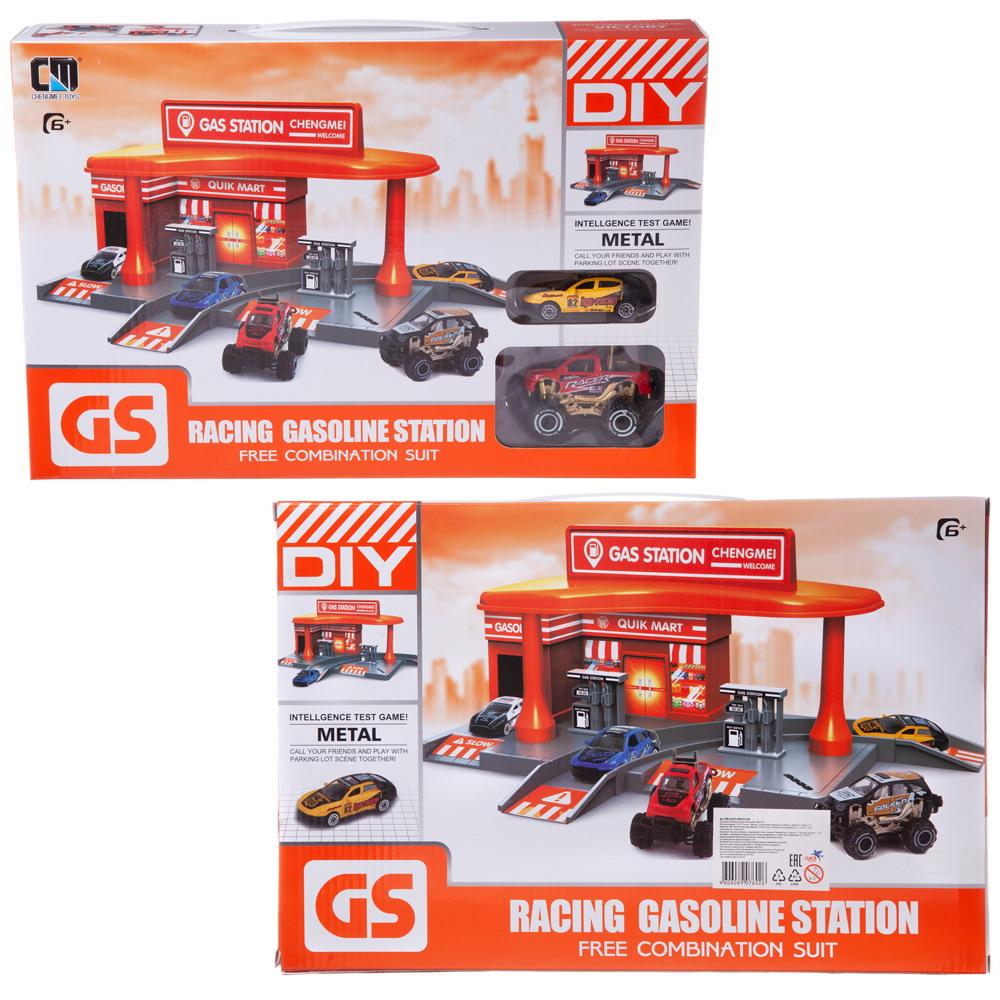 Комплектность: заправочная станция (сборная) - 13 деталей, металлическая машинка - 2 шт. (размер 1 машинки 9х5см, 2 машинки 8х3,5см), лист с наклейками.