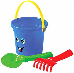 Набор №182: ведро среднее с наклейкой, ситечко, 3 формочки, лопатка, грабельки 19,5х16,5х14,5 см.