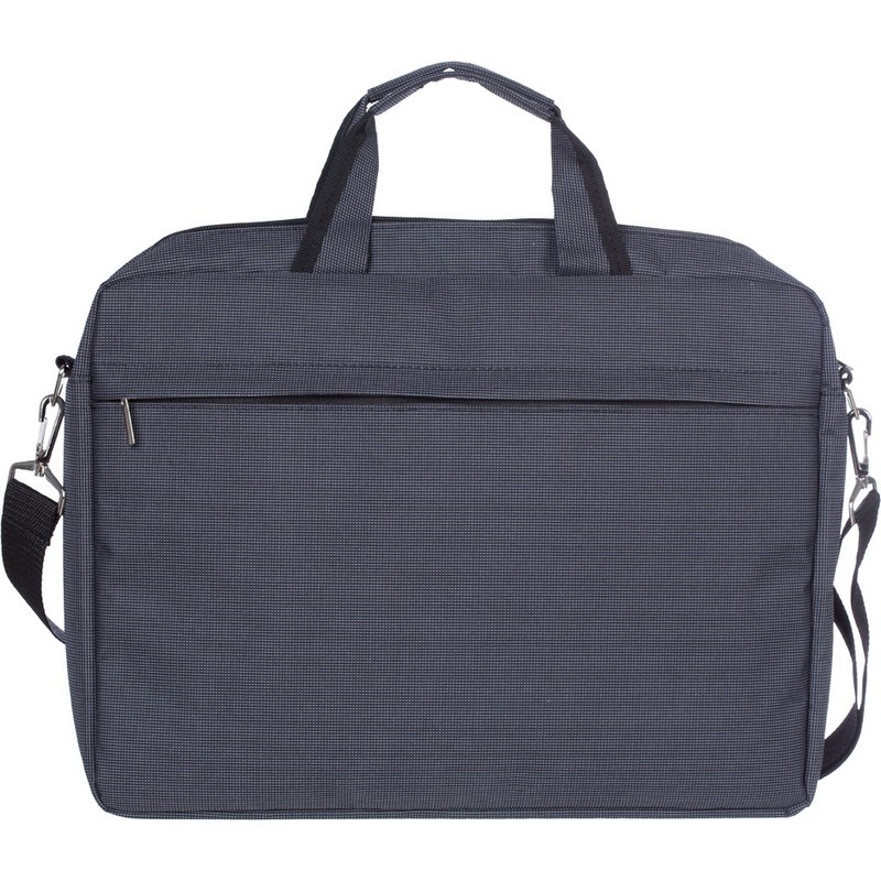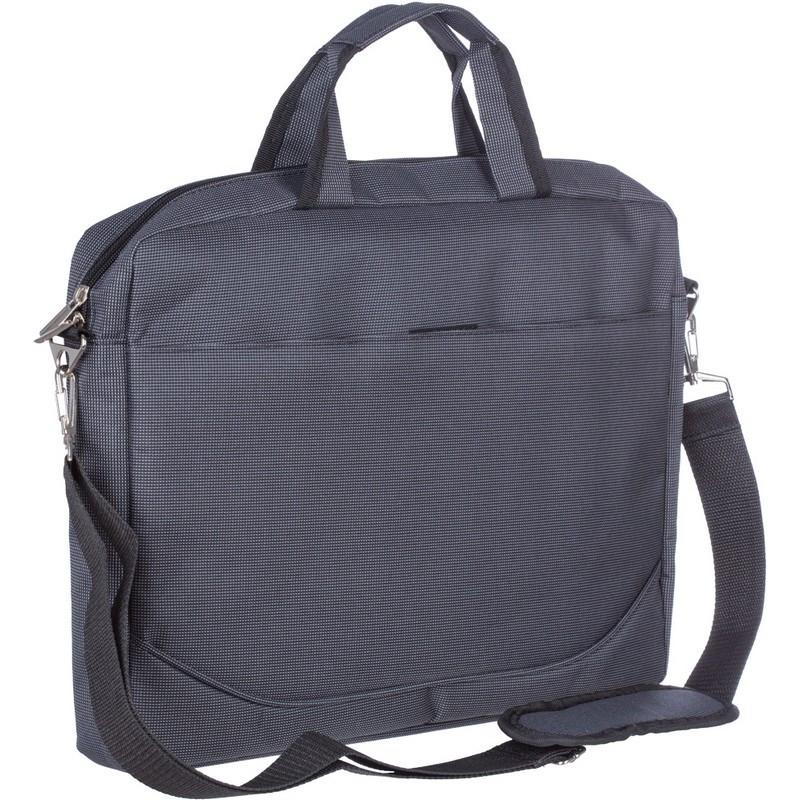 Сумка для документов из полиэстера с уплотнёнными стенками. Внутри — основное отделение и карман для ноутбука, на передней стенке — плоский карман на липучке, на задней стенке — карман на молнии.