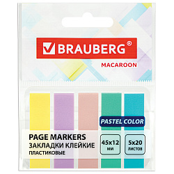 Закладки клейкие пастельные BRAUBERG MACAROON 45х12 мм, 100 штук (5 цветов х 20 листов), 115212