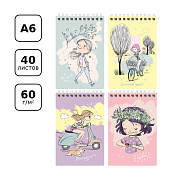 Блокнот с иллюстрациями в пастельных оттенках на обложке представлен в четырёх вариантах дизайна. Изделия поставляются в термоусадочной плёнке комплектом из 24 штук.