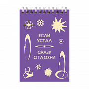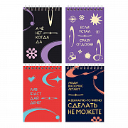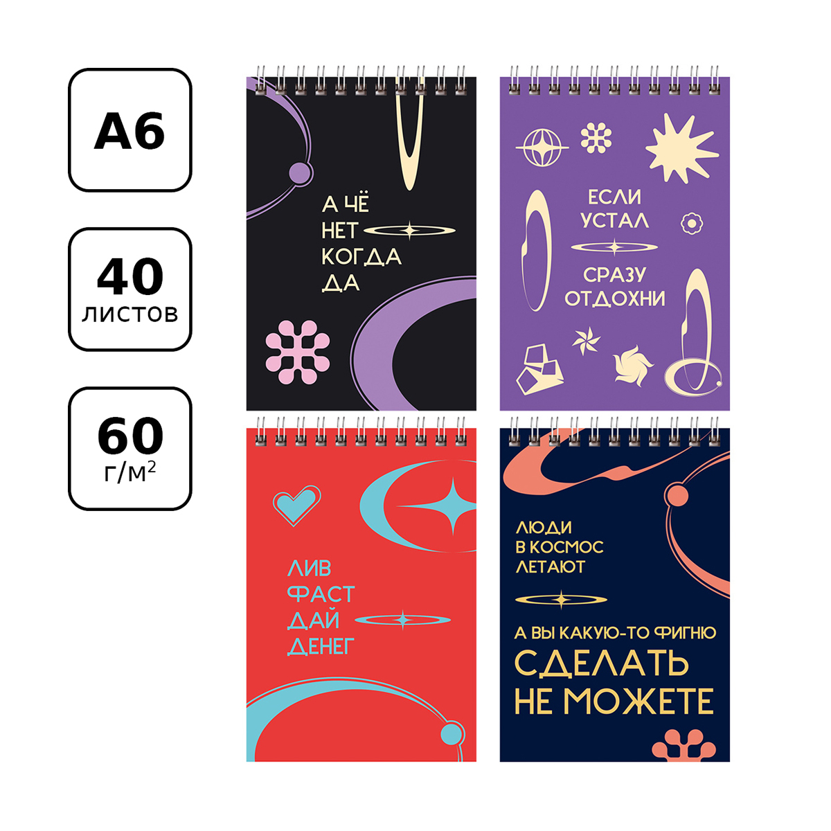 Блокнот с забавными надписями на обложке представлен в четырёх вариантах дизайна. Изделия поставляются в термоусадочной плёнке комплектом из 24 штук.