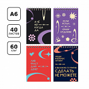 Мягкая, но при этом износостойкая обложка выполнена из мелованного картона. Внутренний блок состоит из 40 листов белого цвета. Записи, сделанные на офсетной бумаге оптимальной плотности 60 г/м2, не будут просвечиваться.