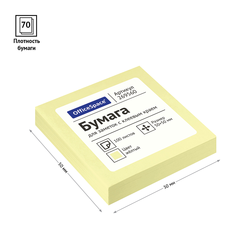 Самоклеящийся блок OfficeSpace 50*50мм, 100л., желтый