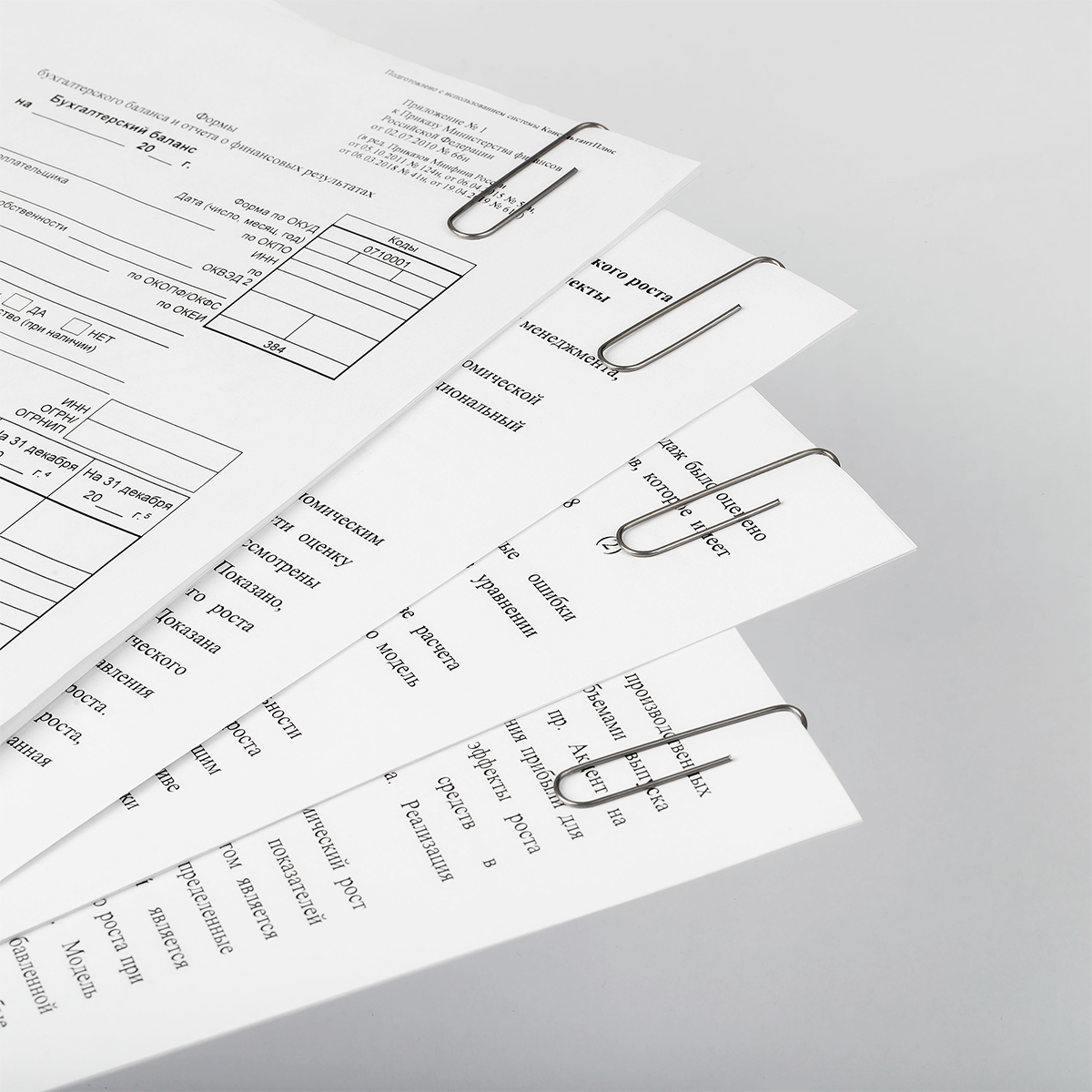 Гладкие скрепки надёжно скрепляют листы, не пачкая и не повреждая бумагу. Упакованы в ПВХ-коробку по 50 штук.