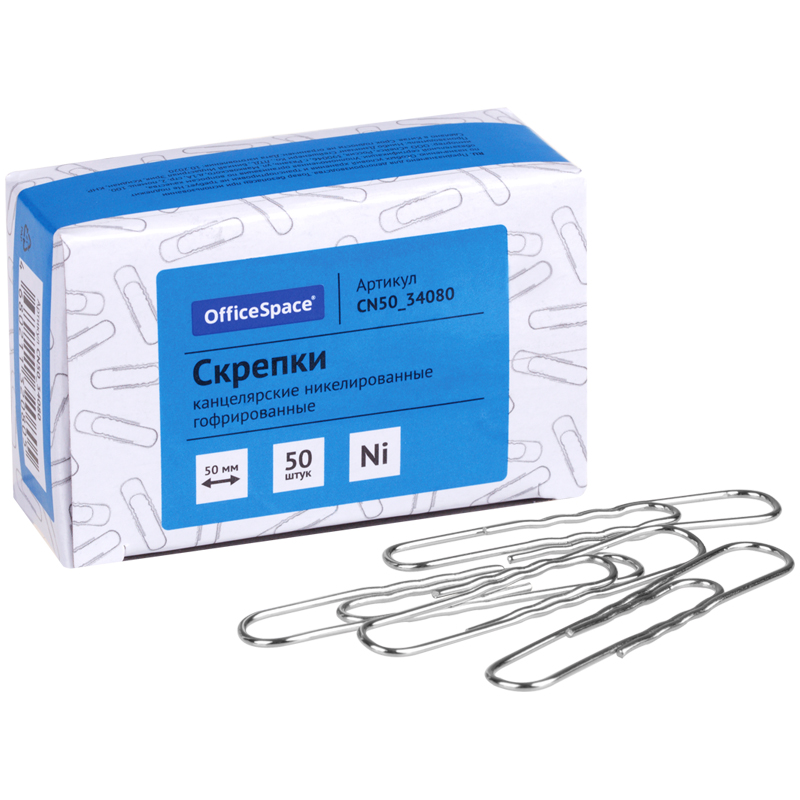 Скрепки 50мм, OfficeSpace, 50шт., никелированные, гофрированные, карт. упаковка