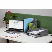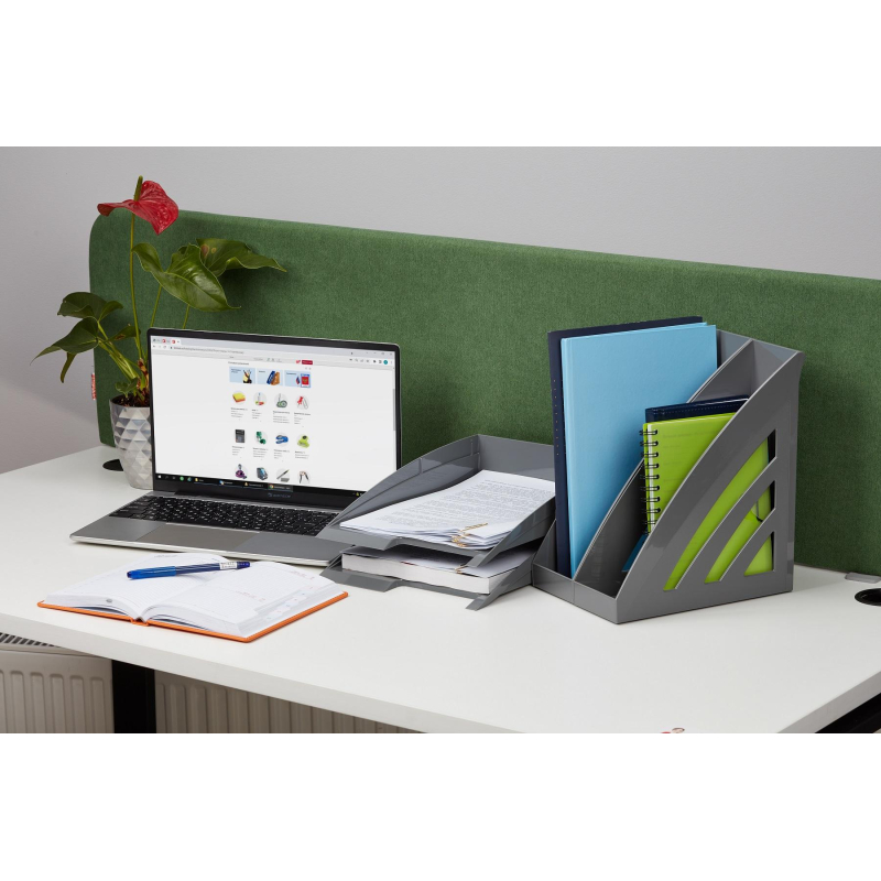 Лоток вертикальный для бумаг формата А4, одно отделение. Оригинальный, яркий дизайн. Устойчивый, вместительный, прочный корпус. Изготовлен из качественного полистирола. Цвет лотка — серый. Размеры (ВхШхГ): 260×90×245 мм.