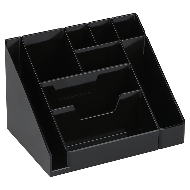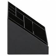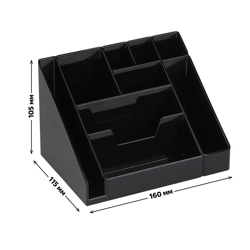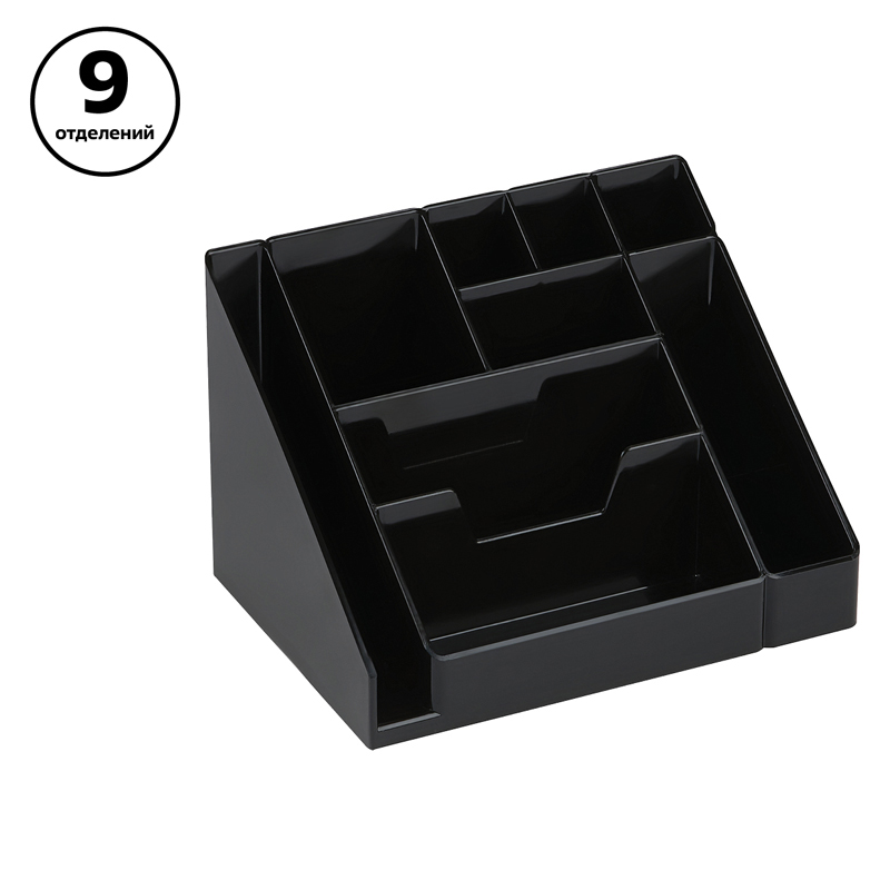 Прочный корпус, гладкая глянцевая поверхность. Девять отделений позволяют хранить множество канцелярских мелочей и пишущих принадлежностей. Изделие высотой 10,3 см, основанием 15,8*11,5 см выполнено из качественного пластика. Цвет - черный.