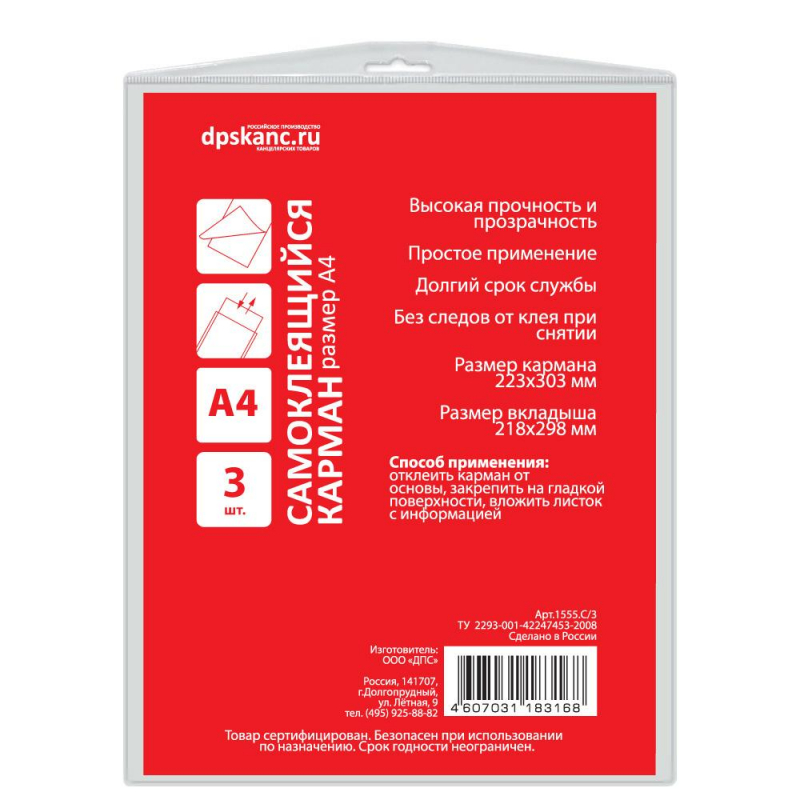 Карман самоклеящийся прозрачный для листов формата А4. Плотность — 180 мкм. Размер — 223×303 мм. Клейкий слой на бумажной основе, которая легко отклеивается, не оставляя следов. Клей постоянный. Предназначен для любых гладких поверхностей: папки, архивные короба, двери, офисные перегородки, информационные доски и многое другое. Способ применения: отклеить карман от основы, закрепить на гладкой поверхности, вложить листок с информацией.