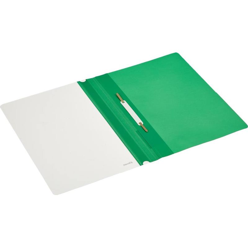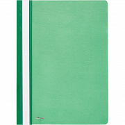 Скоросшиватель используется для хранения различного рода документации, для ведения документооборота, систематизации договоров, других важных бумаг. Папка изготовлена из гладкого пластика. Размер изделия составляет 230×309 мм, что чуть больше формата А4. Толщина верхнего прозрачного листа — 130 мкм, нижнего цветного листа — 180 мкм. С прозрачной верхней обложкой. На лицевой стороне находится карман с белым бумажной полосой для указания содержания, вместимость — 100 листов стандартной плотности. Цвет- зеленый.