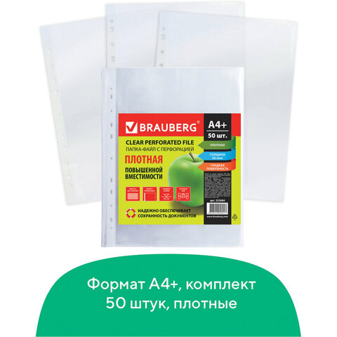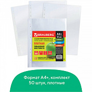 Папки-файлы перфорированные А4+ Brauberg комплект 50 шт, гладкие, плотные 60 мкм