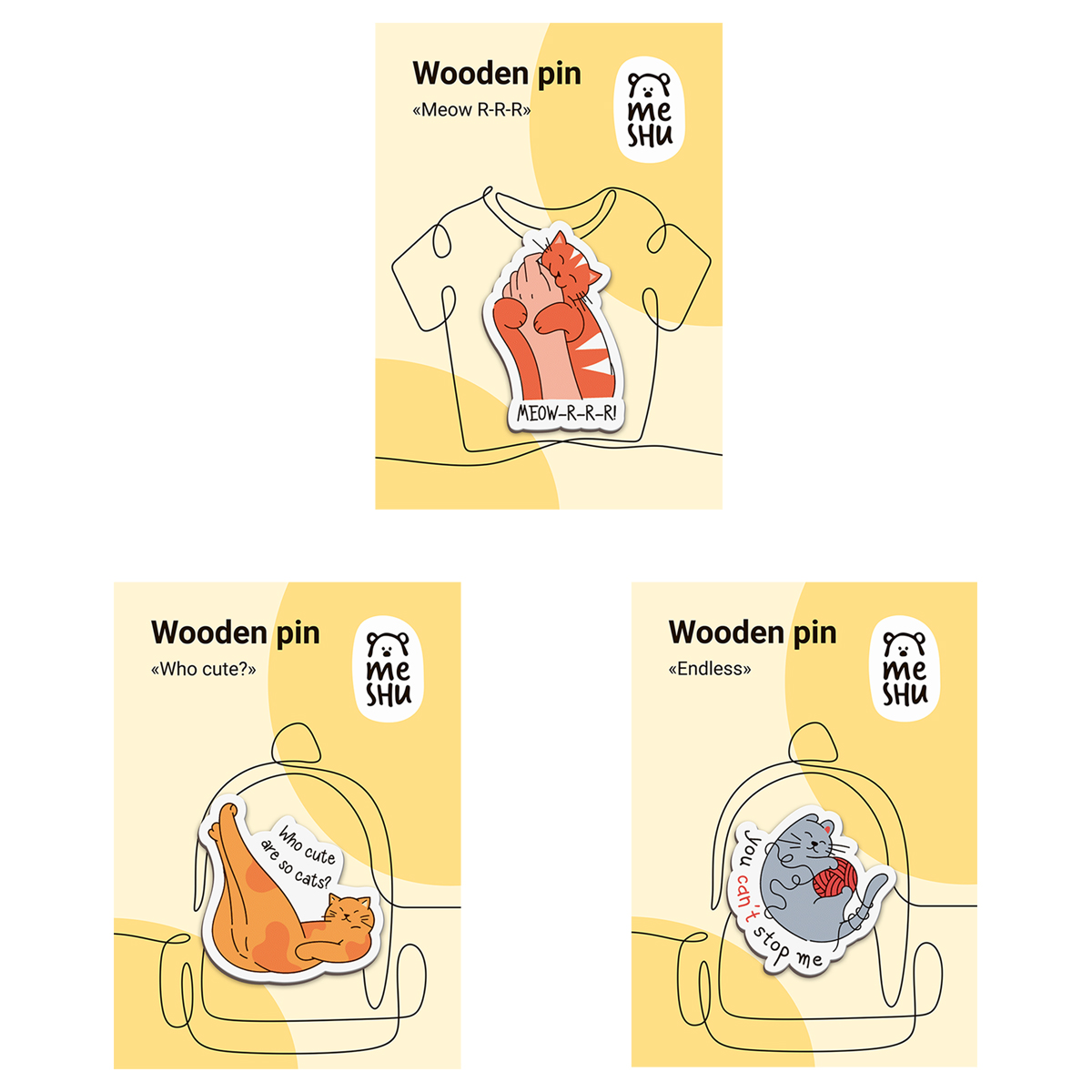 Рисунок нанесён на основу при помощи каширования, благодаря чему изображение получается чётким. В отличие от изделий, где используется наклейка, покрытие на значках MESHU не начнёт отходить со временем. Деревянные значки почти ничего не весят, поэтому подойдут в качестве украшения для элементов гардероба из лёгкой ткани: изделия не порвут и не растянут её. Застёжка-булавка позволяет быстро снять аксессуар, не оставив следов на одежде. Каждый значок из набора упакован в отдельный пакет с европодвесом и штрих-кодом.