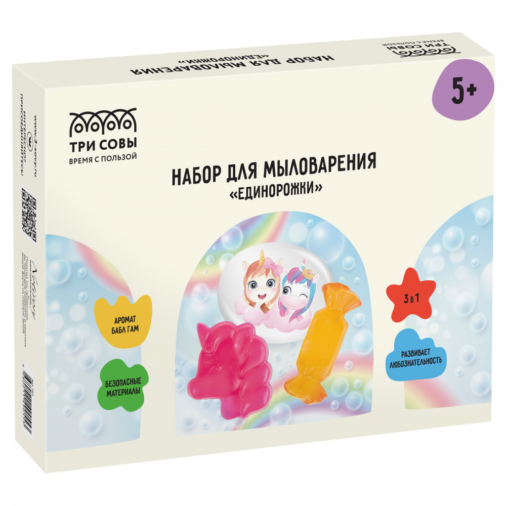 Набор для мыловарения 3в1 ТРИ СОВЫ "Единорожки", 1 мыло с картинкой, 2 классических мыла, картонная коробка