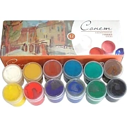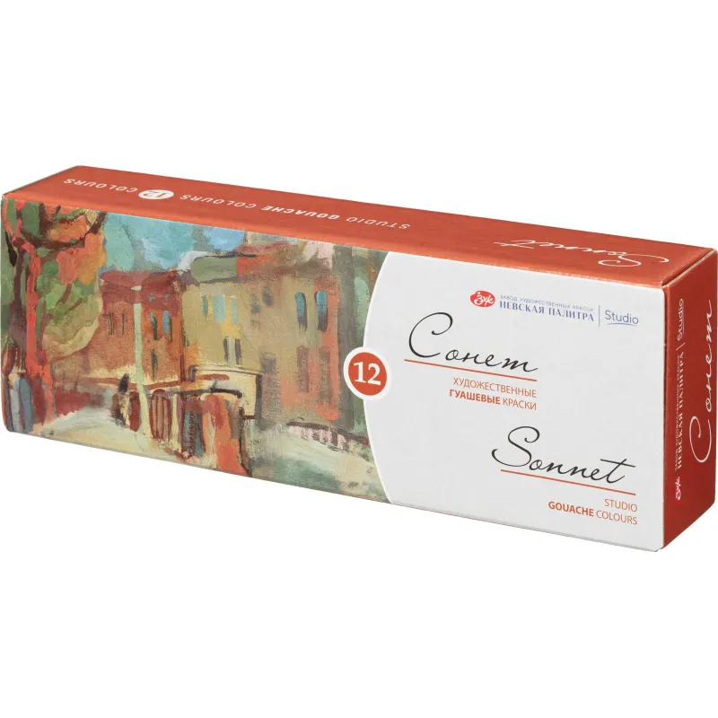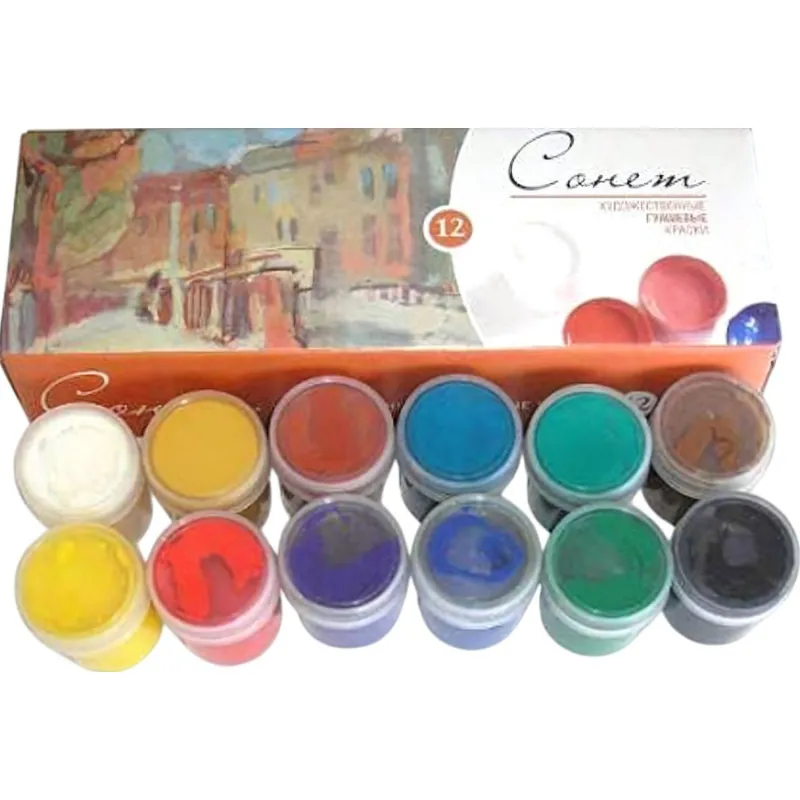 Отличный вариант художественных красок для начинающих. В отличие от профессиональной гуаши, в красках серии ’Сонет’ используются не пигменты, а пигментные пасты. В состав связующих гуаши этой серии не входит гуммиарабик — вместо него использовано синтетическое связующее. Краски легко смешиваются друг с другом и с белилами, создают новые чистые цвета, легко размываются водой. После высыхания краска приобретает матовую текстуру.