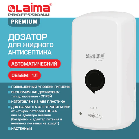 Дозатор для жидкого антисептика LAIMA PROFESSIONAL PREMIUM, СЕНСОРНЫЙ, 1 л, спрей, белый, ABS-пластик, 609513