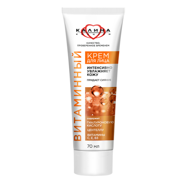 Подарите коже лица сияние и увлажнение с Витаминным кремом концерна КАЛИНА! Витамины С и Е оказывают антиоксидантное действие, улучшают цвет лица. Витамин В3 увлажняет и укрепляет защитный барьер кожи. Гиалуроновая кислота интенсивно увлажняет, поддерживает водный баланс кожи. Экстракт центеллы восстанавливает, уменьшает шелушение. Результат: кожа лица восстановлена, увлажнена и сияет.