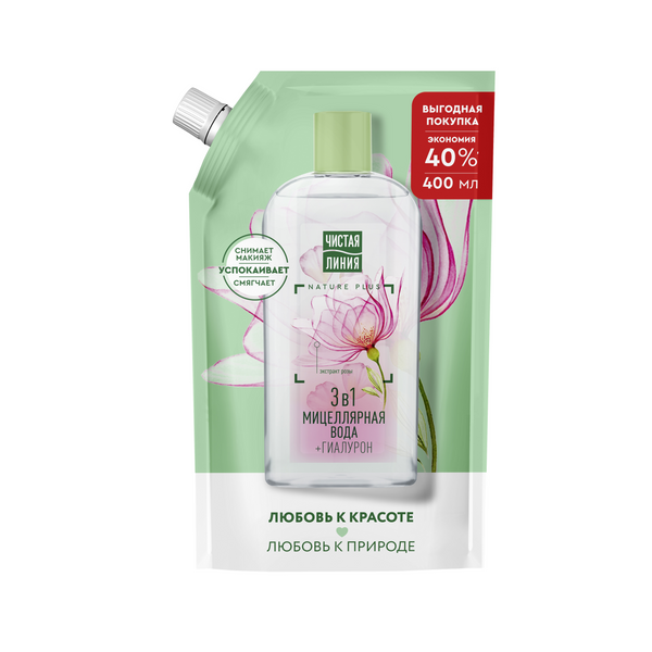 Попробуйте уход и очищение с Мицеллярной водой 3 в 1, которая теперь представлена в формате упаковки дойпак. Он позволяет сэкономить 40% при покупке'. Эксперты бренда Чистая Линия разработали средство для снятия макияжа, в составе которого 97% компонентов натурального происхождения*, в том числе эссенция из пяти экстрактов и масел NATURE PLUS – НЕЙЧЕ ПЛЮС (экстракт вербены, экстракт пиона, масла миндаля, льна, оливы), экстракт лепестков розы и гиалурон.