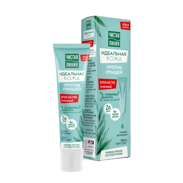 Если нужна срочная помощь против несовершенств кожи, попробуй крем-актив против прыщей Идеальная кожа от Чистой Линии. Новая формула средства с высокоэффективными компонентами поможет тебе быстро справиться с несовершенствами, не пересушивая кожу. Результат будет заметен всего через три дня!* Крем-актив Идеальная кожа эффективно борется с прыщами, нейтрализуя воспаления и следы от них.