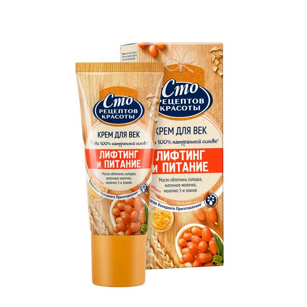 Вся польза лучших рецептов полезного омоложения с облепихой! Крем для век Сто Рецептов Красоты Лифтинг и питание способствует уменьшению темных кругов и питанию нежной кожи вокруг глаз. Входящее в состав масло виноградных косточек обладает множеством свойств, полезных для кожи лица: отшелушивает, успокаивает, питает, смягчает, увлажняет, тонизирует кожу, делает ее более упругой, укрепляет стенки кожных сосудов, улучшает цвет лица, противостоит разрушению волокон коллагена и эластина, защищает от вредного солнечного излучения.