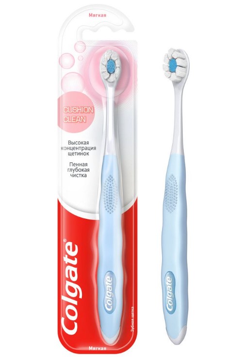 Щетка от производителя Colgate для зубов Cushion Clean с мягкими щетинками, расположенными плотно друг к другу, образует больше пены для лучшего действия зубной пасты, а также оказывают мягкое и массирующее