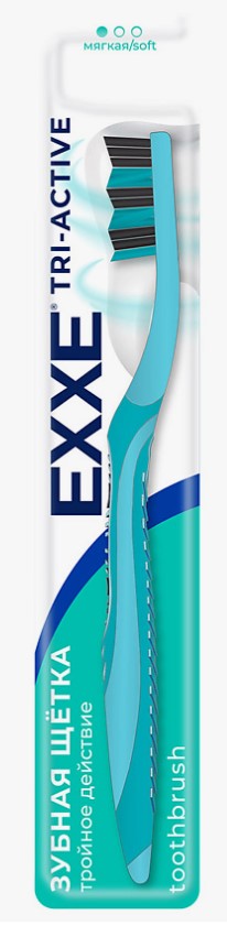 Зубная щетка EXXE tri-active (мягкая) с подстрижкой щетины зигзаг обеспечивает тройное действие: чистота зубов и защита от кариеса, полировка эмали для белизны зубов, бережный уход за деснами. Рельефный рисунок для чистки языка помогает избавится от налета. Массивная ручка с нескользящим покрытием. Щетка представлена в 4-х цветах.