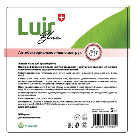 Жидкое мыло «Люир» представляет собой готовую к применению непрозрачную гелеобразную жидкость голубого цвета со слабым специфическим запахом.